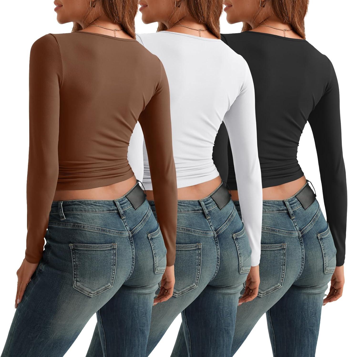 AUTOMET 3 Pack Womens Long Sleeve Shirts Fall Fashion Scoop Neck Crop Tops Basic Layer Slim Fit Y2K Clothes(Black white brown)