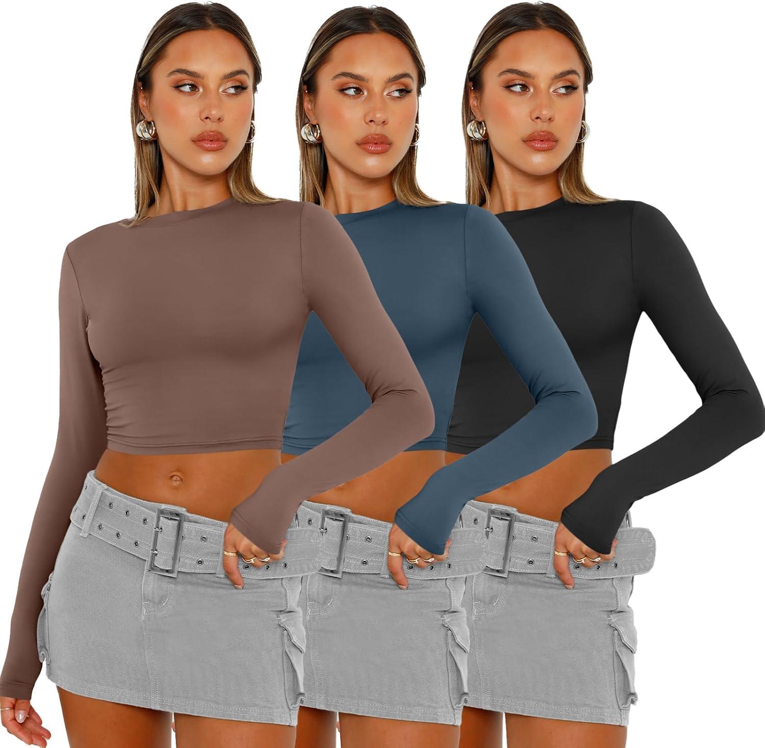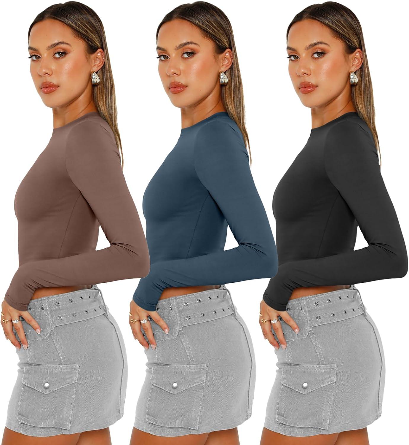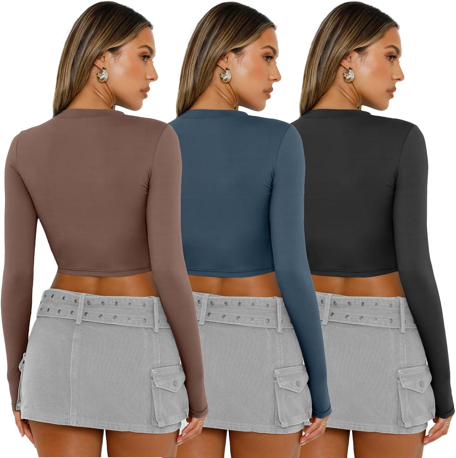 AUTOMET 3 Pack Womens Long Sleeve Shirts Y2K Going Out Crop Tops Cute Basic Slim Fitted Fall Fashion Outfits 2025 Clothes(Coffegreyblueblack)