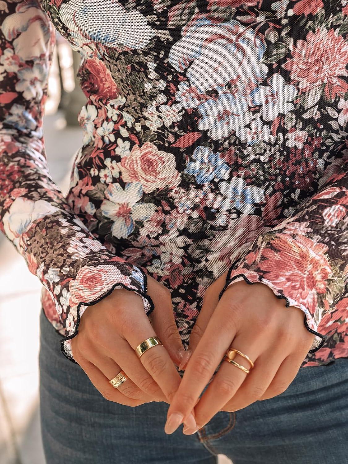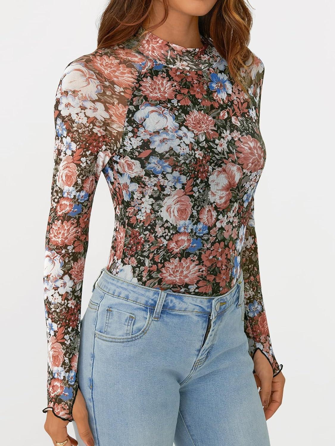 AUTOMET Lace Long Sleeve Floral Mesh Mockneck Going Out Tops for Women Fall Fashion Outfits 2025(Floral Fierce)
