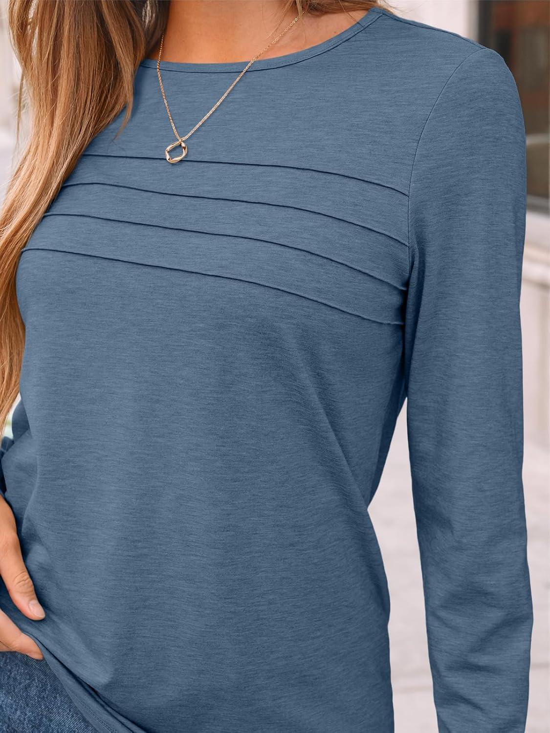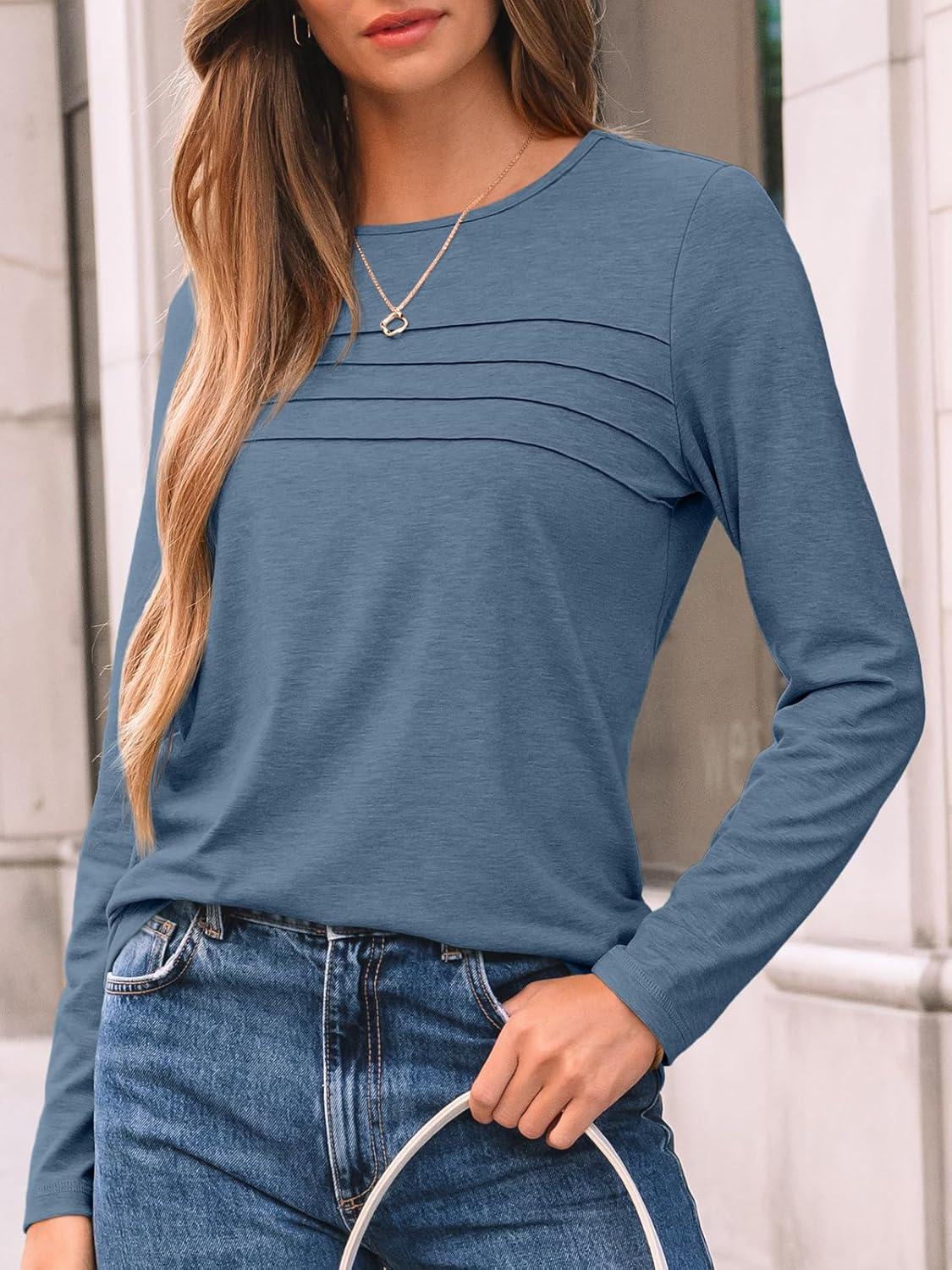 AUTOMET Long Sleeve Shirts for Women Pleated Dressy Casual Business Blouses Trendy Fashion Tunic Basic Tops(Grey Blue)