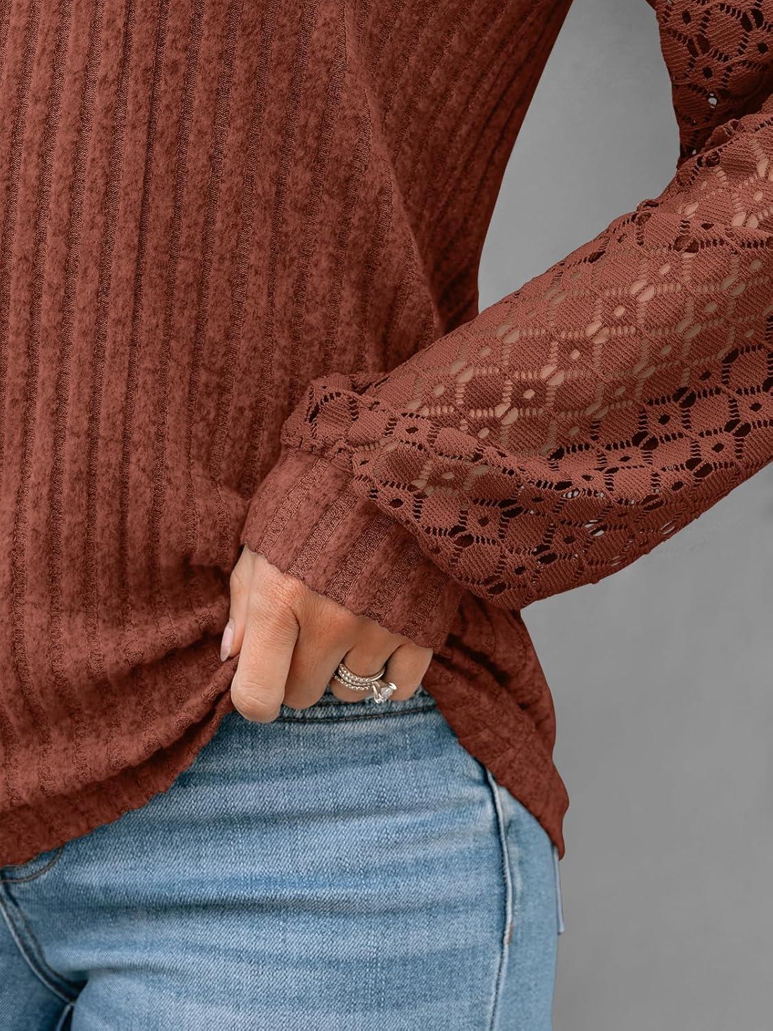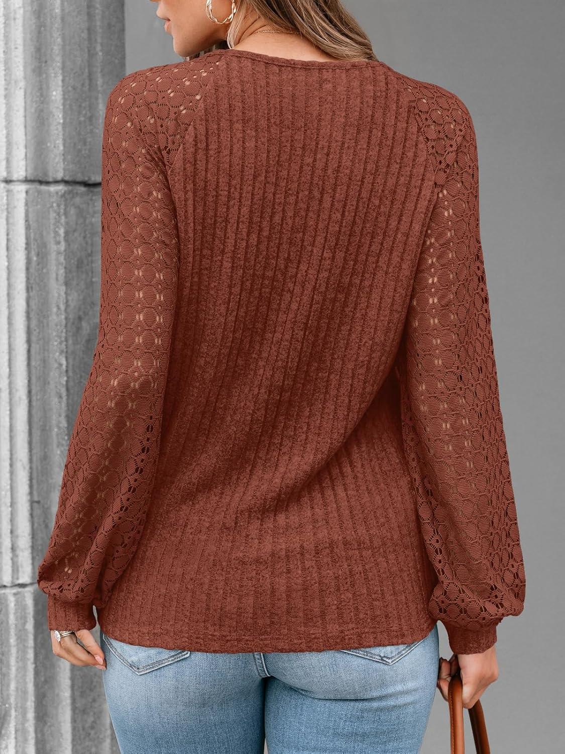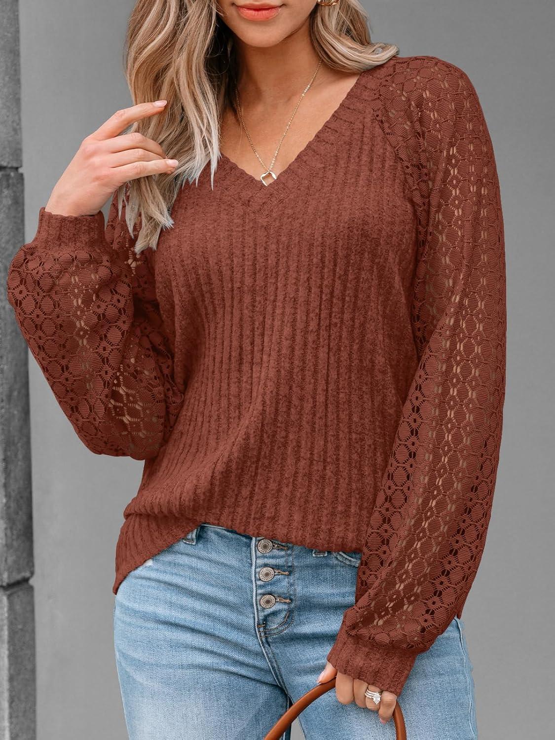 AUTOMET Women Long Sleeve Shirts Fall Lace Tops 2025 Fashion V Neck Sweaters Dressy Casual Winter Tunic Blouse Trendy Outfit(Rust)
