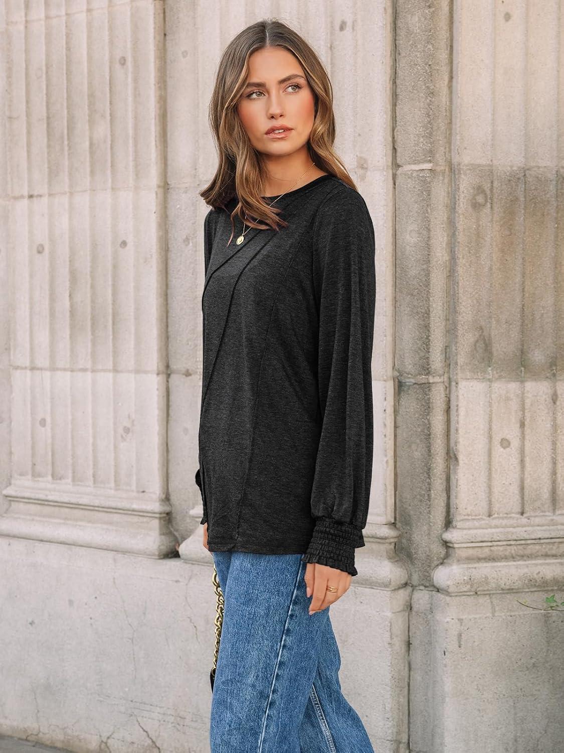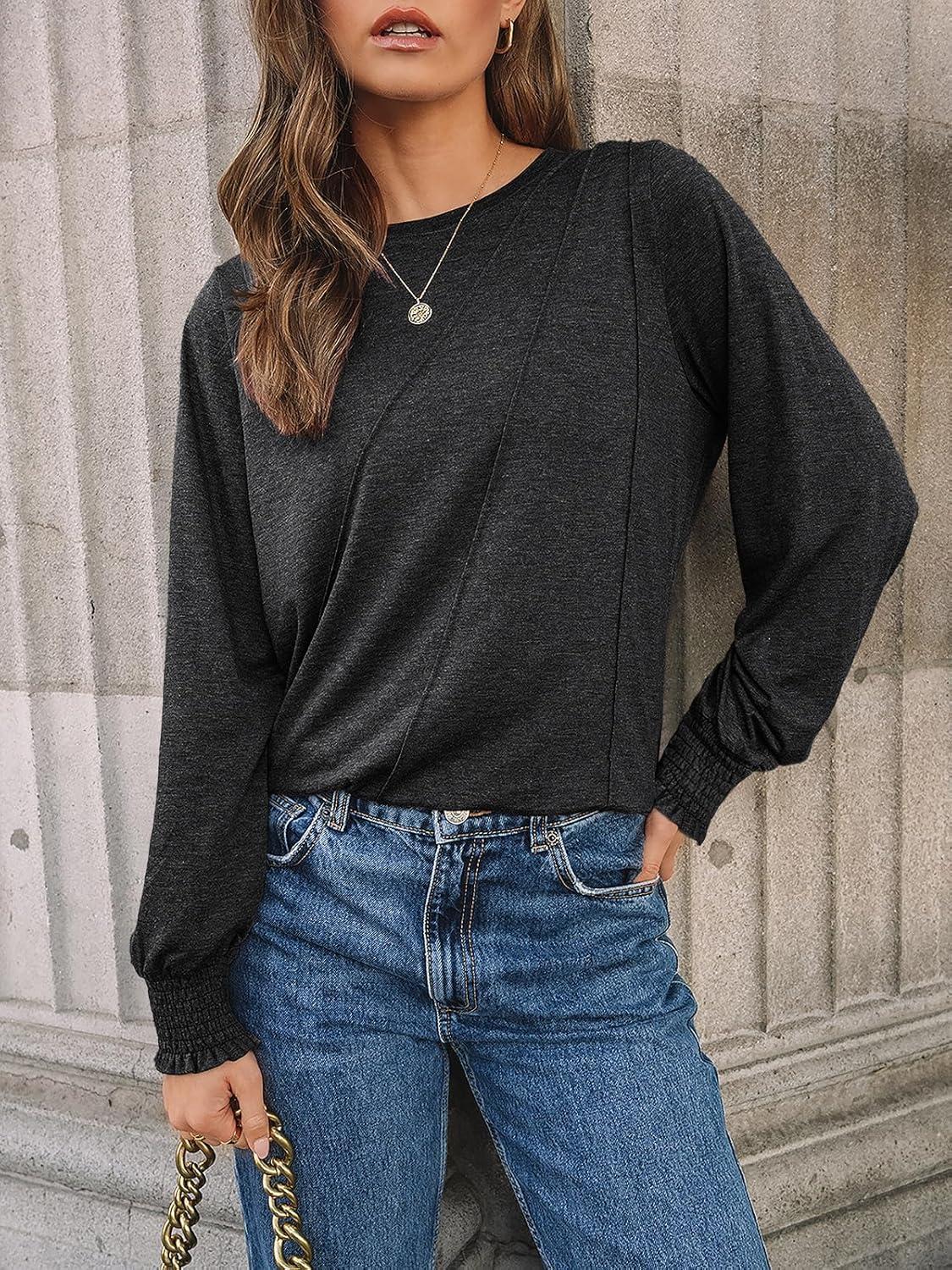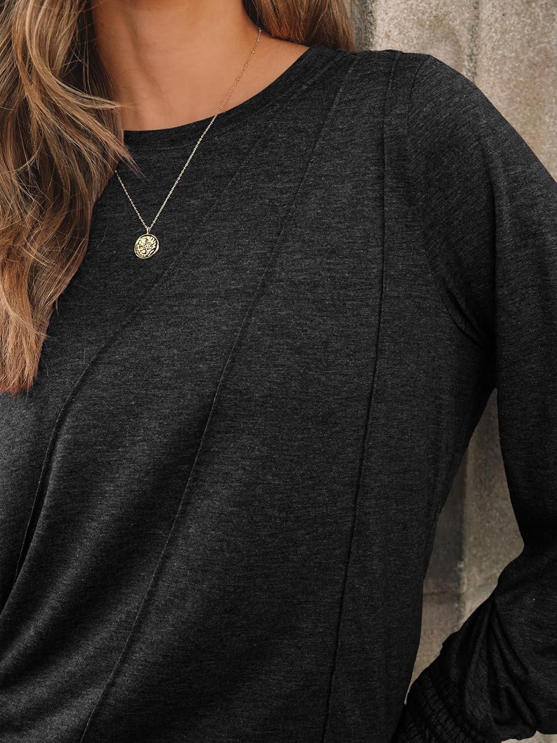 AUTOMET Womens Long Sleeve Tops Pleated Crew Neck Business Casual Blouses Fashion Clothes 2025 Trendy Outfits(Black)