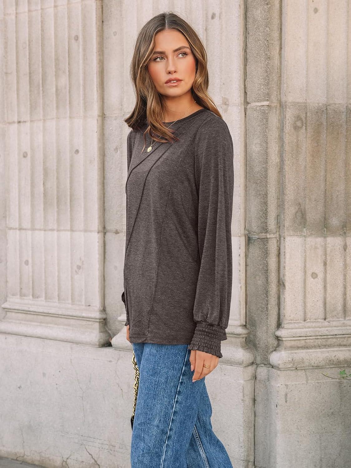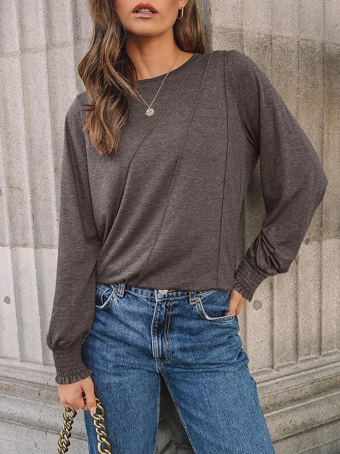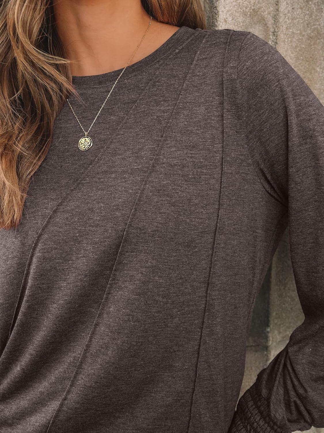 AUTOMET Womens Long Sleeve Tops Pleated Crew Neck Business Casual Blouses Fashion Clothes 2025 Trendy Outfits(Coffee Gray)