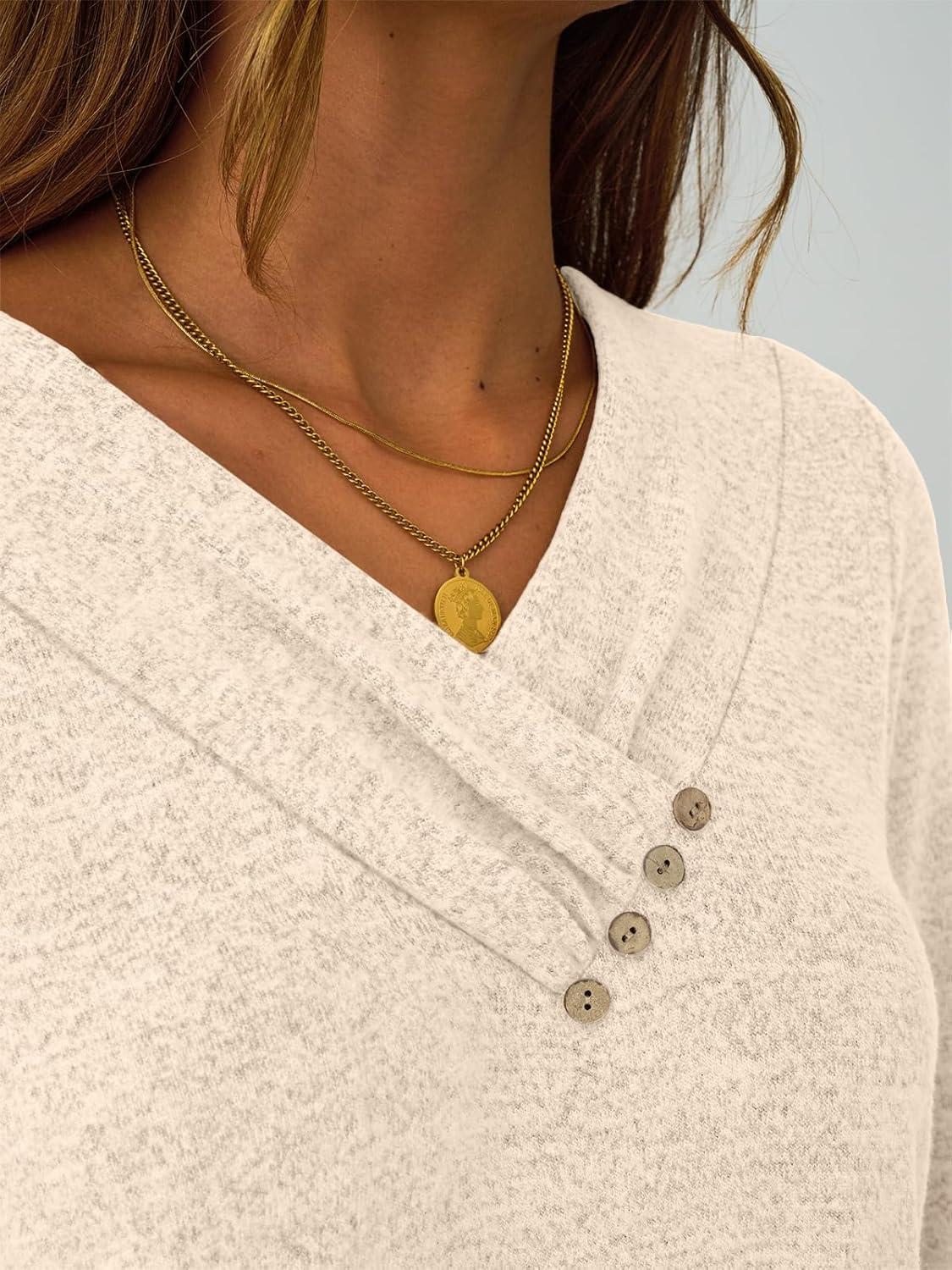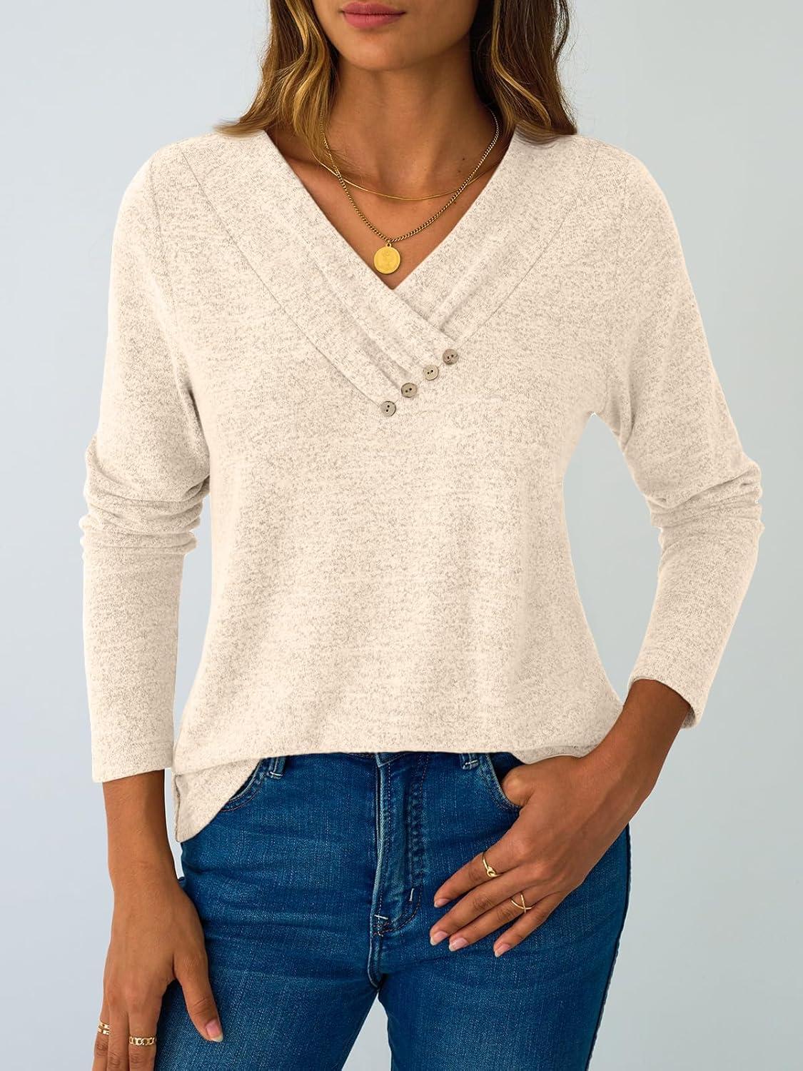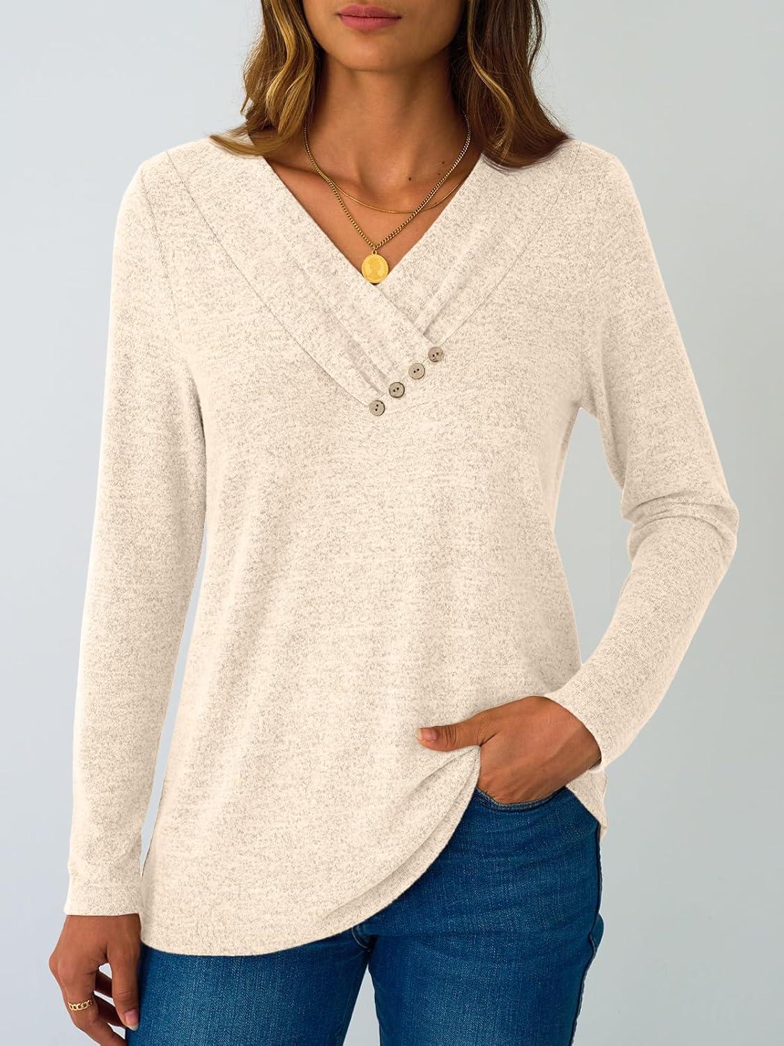 AUTOMET Womens Long Sleeve Tunic Top V Neck Button Shirts 2025 Dressy Casual Business Blouses(Apricot)